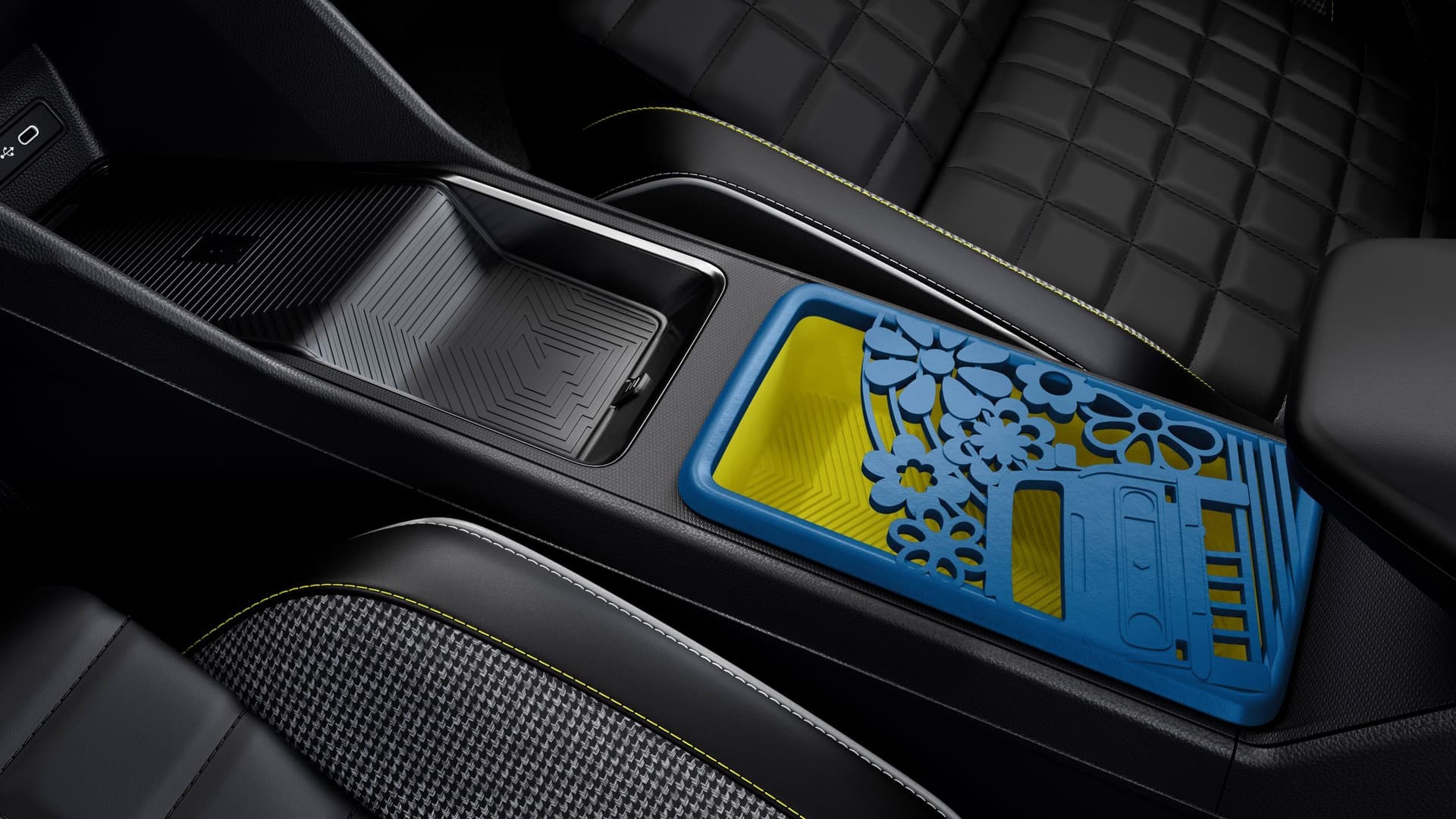 Tilpass interiøret i din Renault 4 med tilbehør 3D-printet ved Renaults fabrikk i Flins: en skillevegg og små og store oppbevaringsbokser til midtkonsollen. Du kan også gi bilen en unik touch ved å velge ditt eget håndtak til girspaken.
